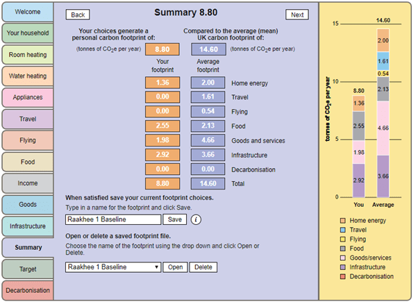 The OU calculator allows students to set their own personal reduction target, I set mine at 20%. In order to find areas where I could reduce my carbon footprint further, I had the ability to amend my answers; efficient loft insulation, using the dryer less, showers instead of baths (or quicker showers), changes to travel habits, buying second-hand instead of brand new and looking at changing your diet by eating less meat. By looking at these, it allowed me to identify areas I felt I could make changes in order to hit my target.